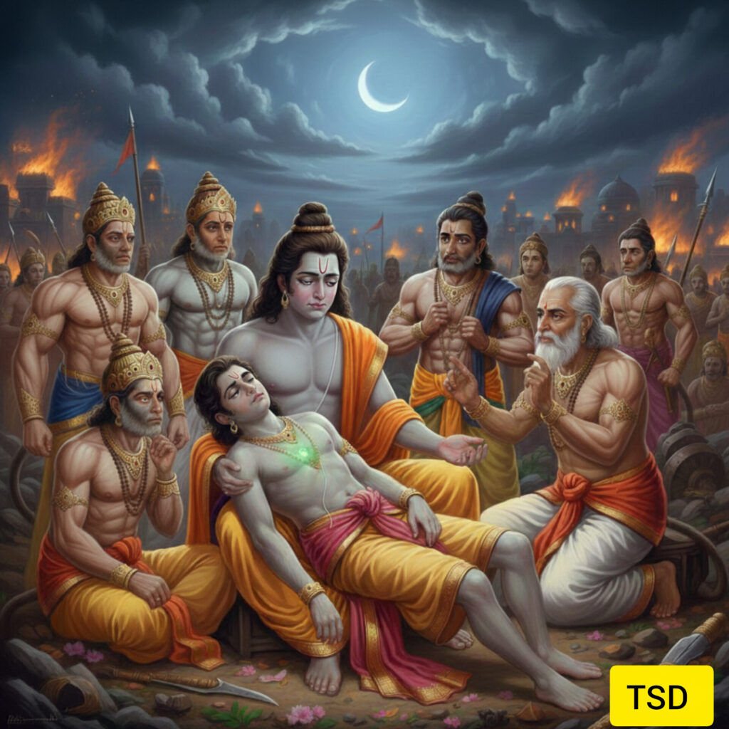 युद्ध के मैदान में मेघनाद ने लक्ष्मण जी पर अमोघ ‘शक्ति बाण’ का प्रयोग किया, जिससे वे गहरे कोमा (मूर्छा) में चले गए। लंका के राजवैद्य सुषेण ने बताया कि सूर्योदय से पहले हिमालय के द्रोणागिरी पर्वत से ‘संजीवनी बूटी’ लानी होगी, अन्यथा लक्ष्मण के प्राण नहीं बचेंगे।