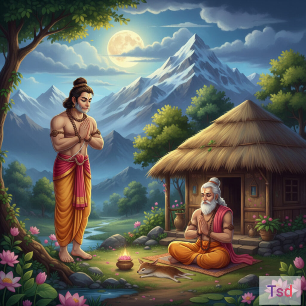 हनुमान जी ने साधु (कालनेमि) को प्रणाम किया। कालनेमि ने बड़ी ही चतुराई से हनुमान जी का स्वागत किया और उन्हें राम कथा सुनाने लगा। उसने कहा, “हे वानर वीर! मैं अपनी दिव्य दृष्टि से देख रहा हूँ कि तुम किसी महान कार्य के लिए जा रहे हो। तुम थोड़े समय यहाँ विश्राम करो, भोजन करो और पास के सरोवर में स्नान कर अपनी थकान मिटाओ, फिर जाना।”