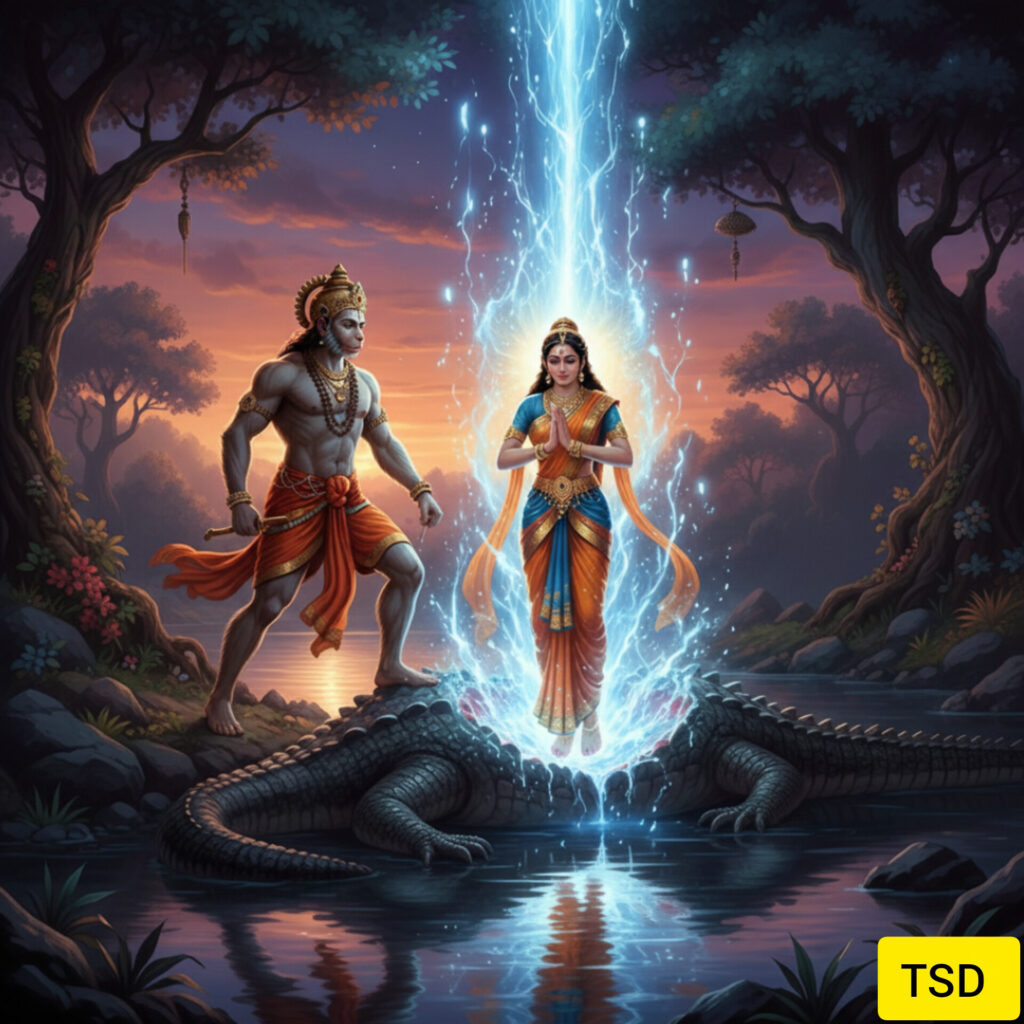हनुमान जी जैसे ही सरोवर में स्नान करने उतरे, एक विशाल और भयानक मकरी (मगरमच्छनी) ने उनका पैर पकड़ लिया। वह मकरी कोई साधारण जीव नहीं थी। हनुमान जी ने पलक झपकते ही उस मकरी को पकड़ लिया और जैसे ही उन्होंने उसे मारा, वह एक दिव्य अप्सरा (धान्यमाली) के रूप में बदल गई।